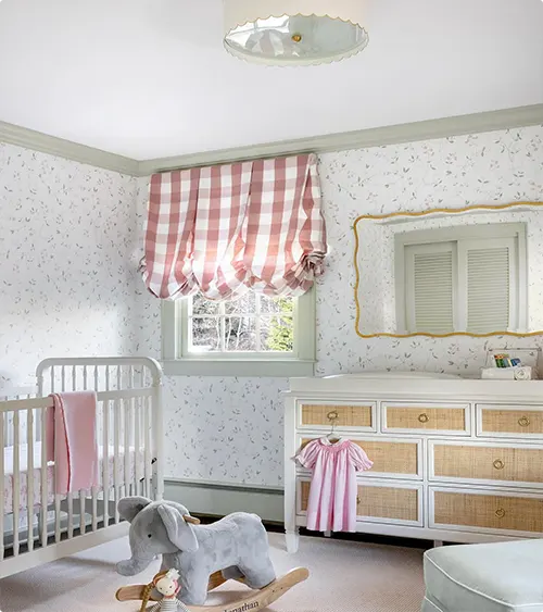 There’s a wicker basket on wheels in the corner. One of those old-school ones. And a gingham ottoman that probably cost more than it should but looks perfect anyway.