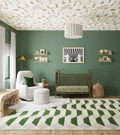 The brass crib in the middle has this vintage feel. It’s darker than the usual metallics you see. There’s a white nursing chair with a green pillow that pulls the whole color story together.