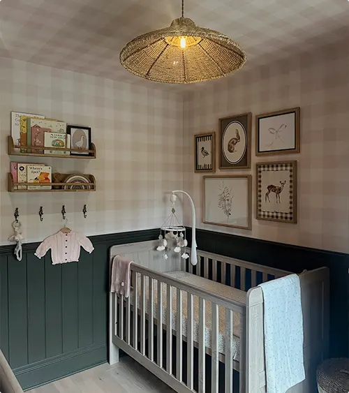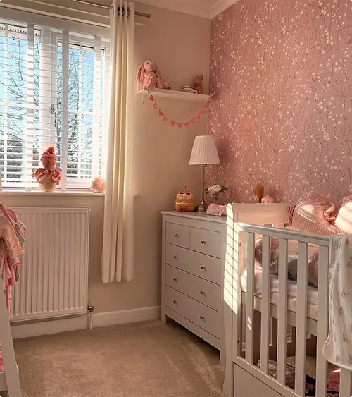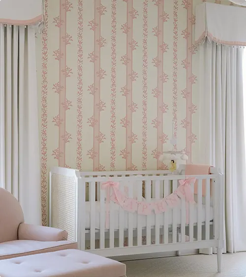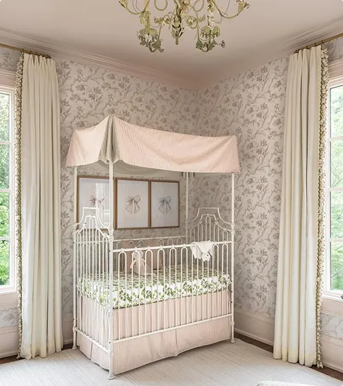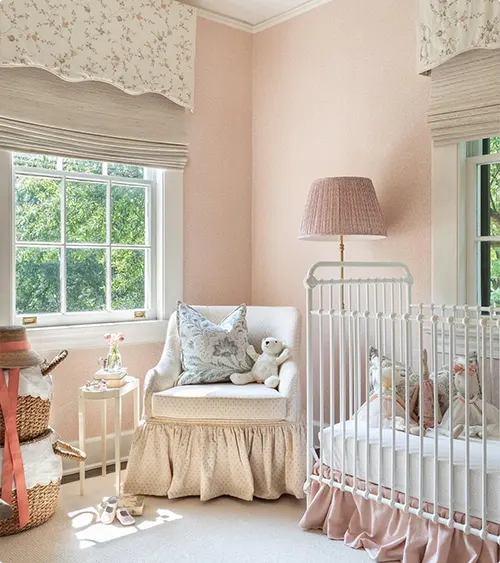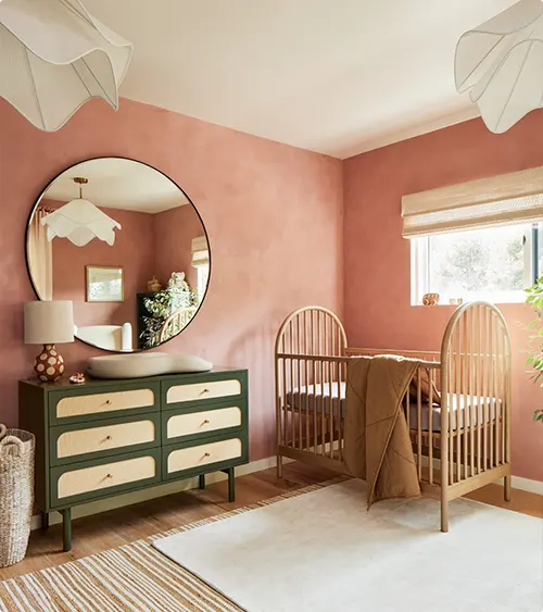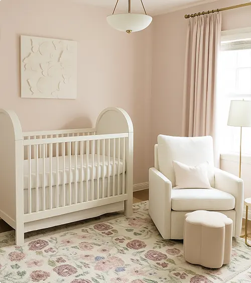 The walls are this barely-there blush. The kind of pink that doesn’t really commit to being pink. And the white crib underneath keeps things crisp.