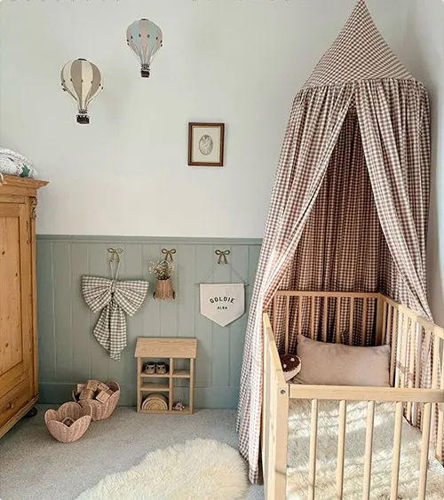 The gingham canopy over the crib matches the hot air balloons. It’s brown and white checks, falling down like a tent. The wooden crib underneath stays natural and simple.