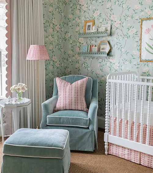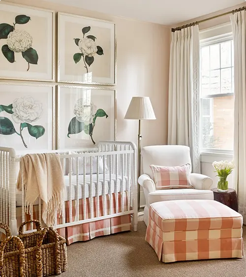 That checkered glider with the ottoman is giving grandma’s house but in the best way. The peach tones in the fabric pull from the pink without copying it exactly.
