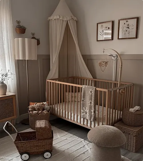 The taupe walls here are so neutral they almost disappear. Then you’ve got this cream canopy draping over a wooden crib that looks like it was made by someone’s grandfather.