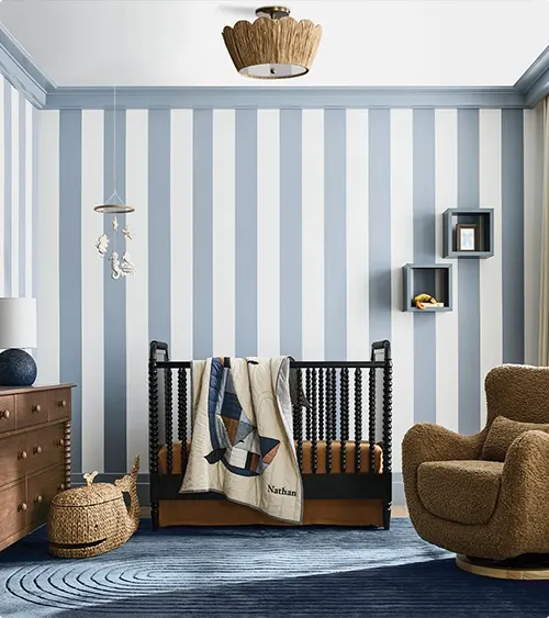 The striped wallpaper here is subtle. Thin gray and white lines that create texture without overwhelming the space. Then you’ve got that blue crown molding that wraps around the whole room.