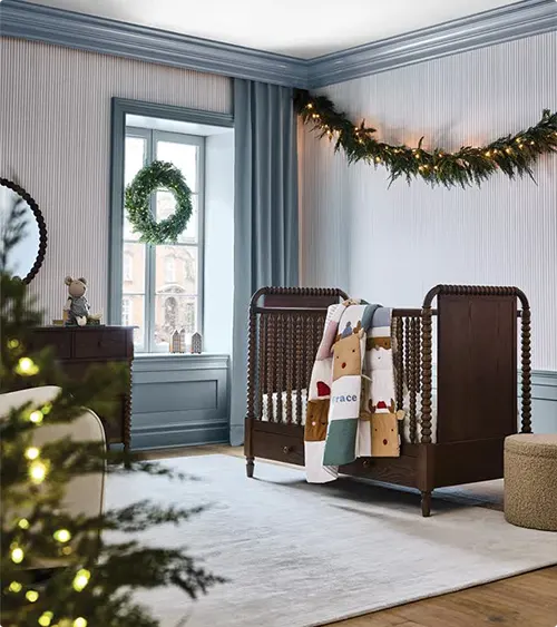 The dark wood crib matches the window trim. There’s a Christmas tree in the corner with lights and a garland strung across the wall, which makes this feel extra cozy. Sometimes nursery photos catch seasonal moments and this one’s got all the winter feels.