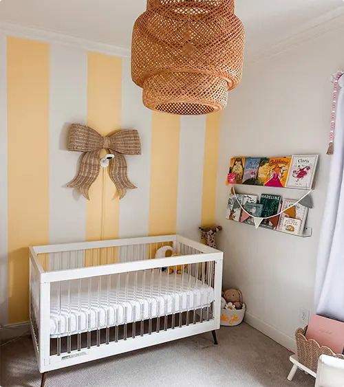 There’s a pink chair peeking into the frame. Probably where all the bedtime stories happen. The whole room feels sunny even if it’s not, which is kind of the magic of yellow.