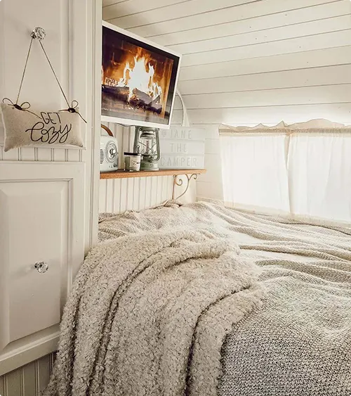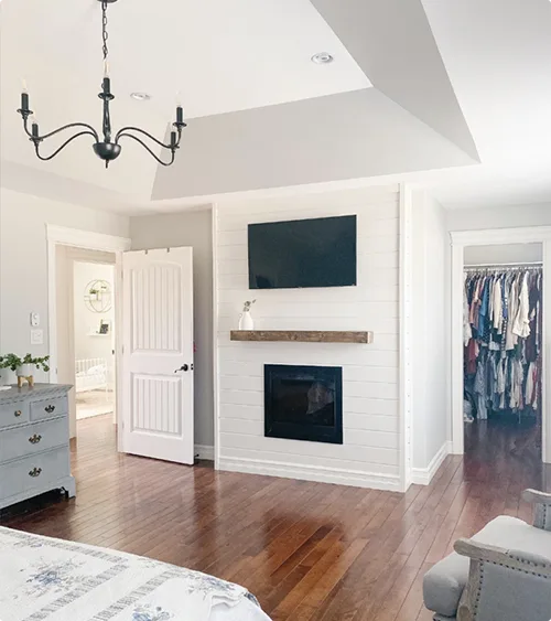 This bedroom has serious cottage vibes. The shiplap walls are painted white, and the TV is actually a digital fireplace screen.