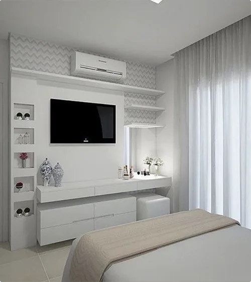 Everything’s white, so it keeps the room bright. If you have a small bedroom, this kind of setup makes the most of your wall space.