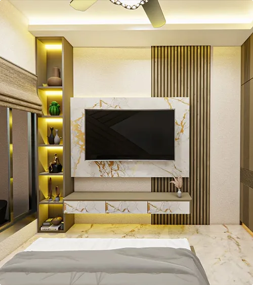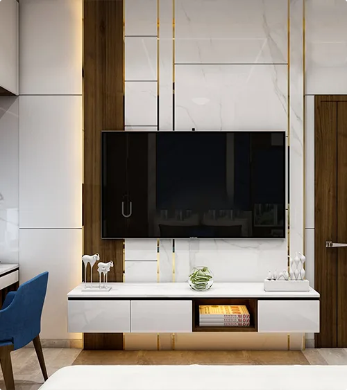 The white marble panel has gold veins that make the TV wall feel expensive. It’s a statement without being loud.