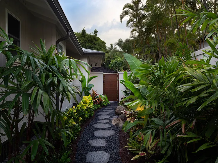 Round stepping stones lead through black rock surrounded by huge tropical leaves and palms. The planting is dense and jungle-like.