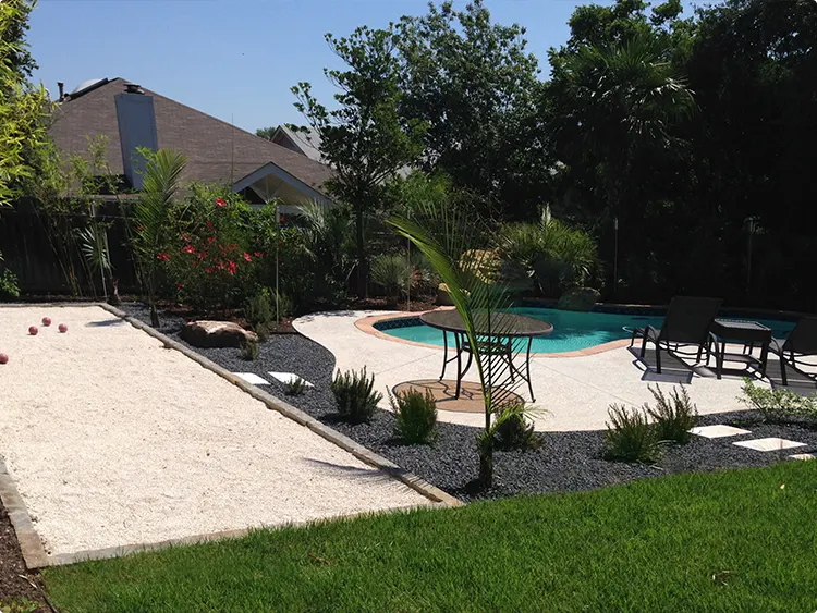 The rock creates separation between the pool deck and lawn. It’s clean, modern, and doesn’t require any watering.