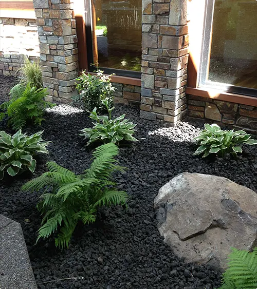 This is great for shaded foundation areas. The black rock keeps weeds down and makes the stone columns pop.