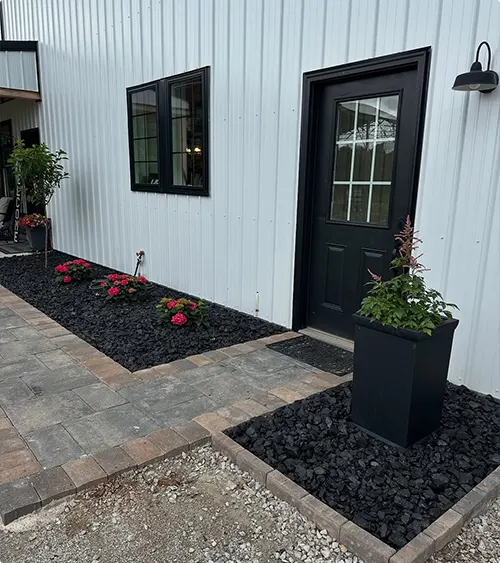 A narrow bed of black rock runs along the white farmhouse siding. Gray pavers create pathways and a small patio area.