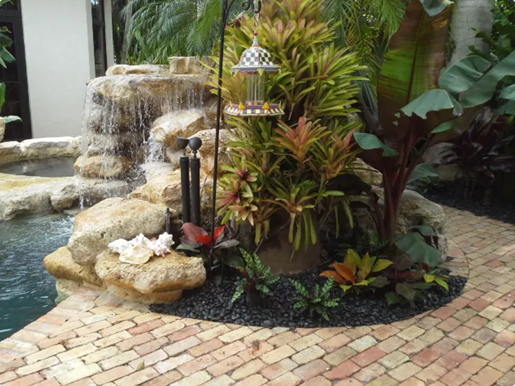 If you’re in a warm climate, leaning into tropical vibes with black rock as the base layer creates instant drama. The stones keep it grounded.