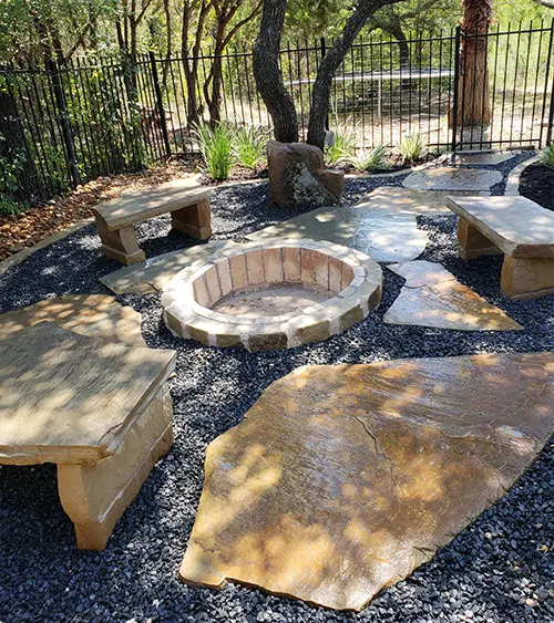 A circular stone fire pit sits at the center of a black rock patio area. Large flat stones create tabletops and seating surfaces.