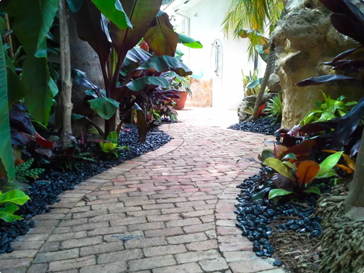 An old brick pathway runs between beds of black rock and massive tropical plants. The foliage is dense, with huge leaves in greens and deep burgundy.