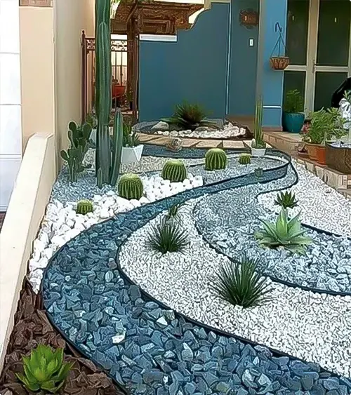 This is desert landscaping with serious style. Using two rock colors like this turns your yard into art.