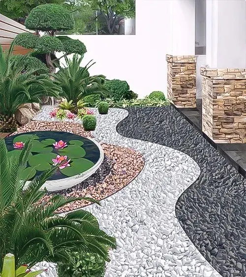 A small pond with lily pads sits at the edge, surrounded by lush tropical plants. Each rock color has its own purpose.