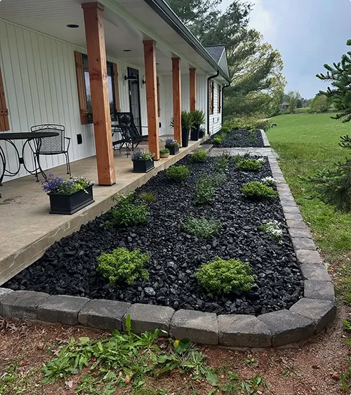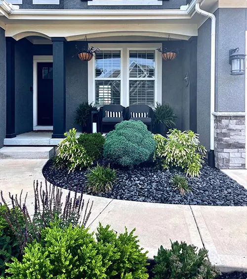 This creates a clean transition from house to lawn. Foundation beds with black rock feel finished and require way less maintenance than traditional mulch.