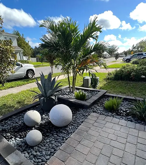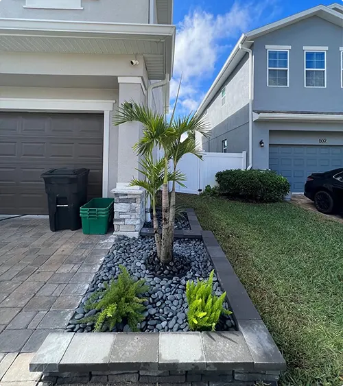 A raised rectangular planter bed sits between the driveway and lawn, filled with black rock and a single palm tree. Gray stone blocks form the clean-lined border.
