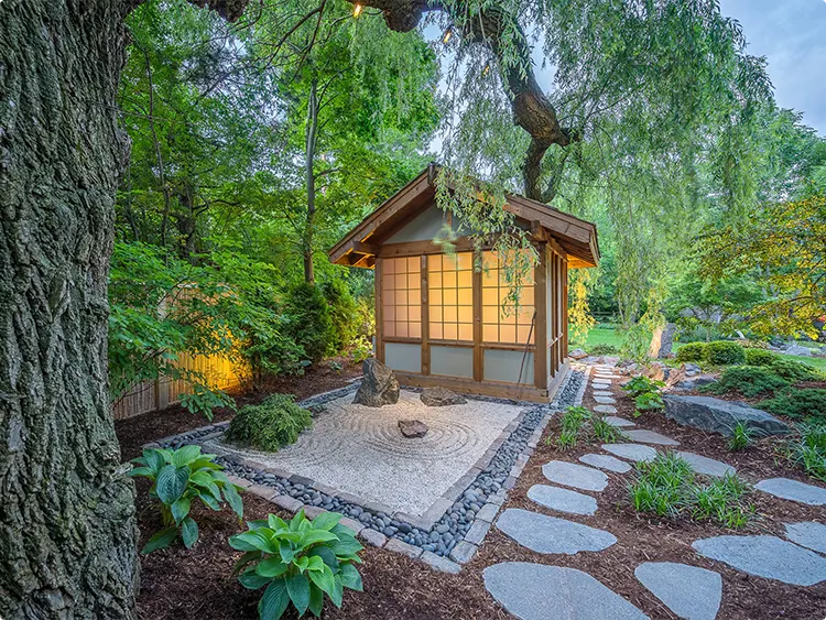 A small Japanese-style tea house sits at the center of this zen garden. Black rock borders frame the raked gravel, creating clean separation.