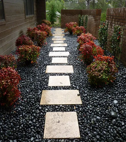 Large light-colored stepping stones create a winding path through a bed of black rock. The contrast is striking and super practical.