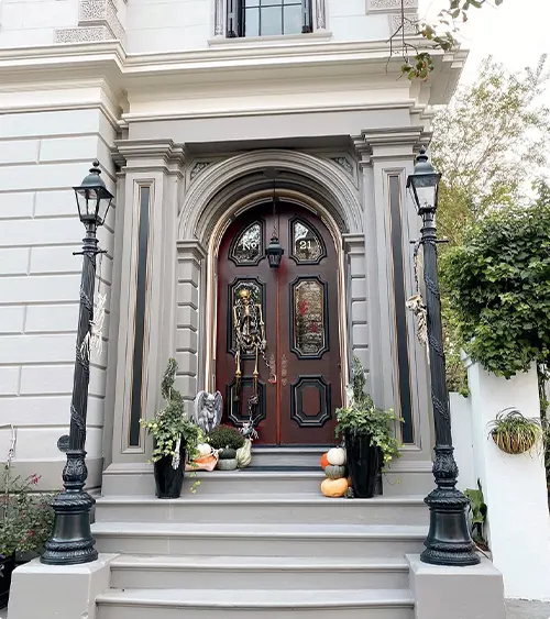 Stacked pumpkins in black, white, and orange patterns flank the doors. It’s bold but somehow still feels classy.