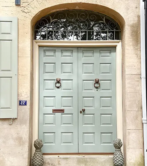 Mint green double doors with multiple panels have this European charm. The color is calming and different from the usual black or white.