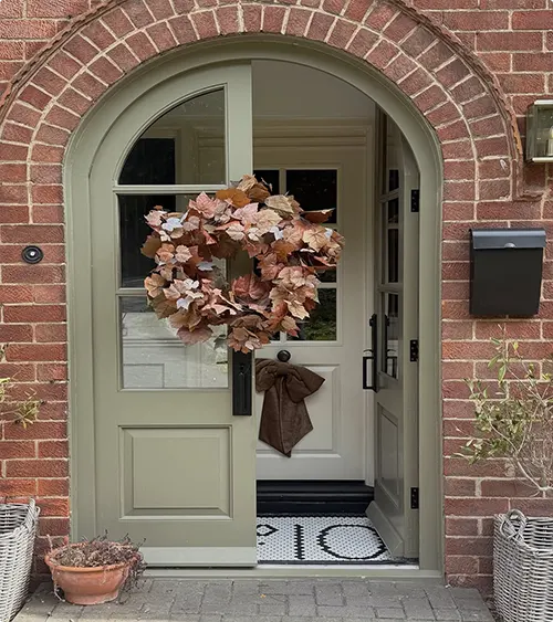 Sage green double doors under a brick arch feel calm and earthy. The color works beautifully with the warm red brick surrounding it.