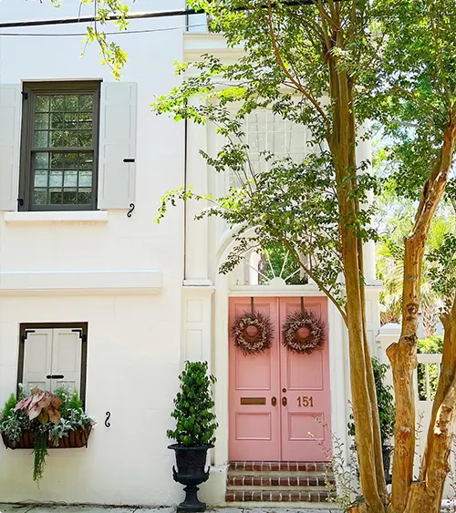 Pink double doors on a white townhouse feel cheerful and unexpected. The soft blush tone works because everything else is so neutral.
