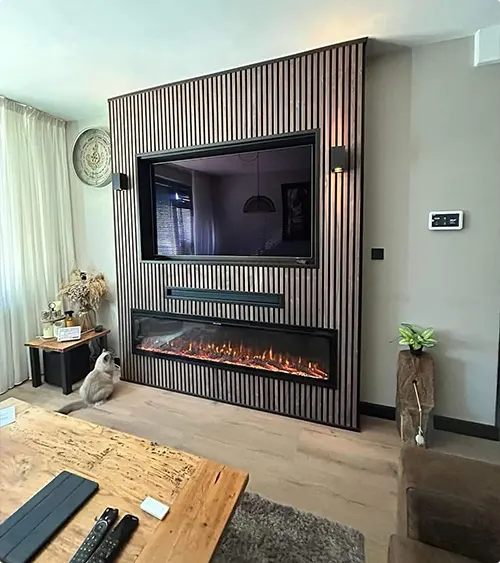 Vertical wood slats frame the TV and electric fireplace below. The natural wood tones warm up the space and pair nicely with the pale walls.