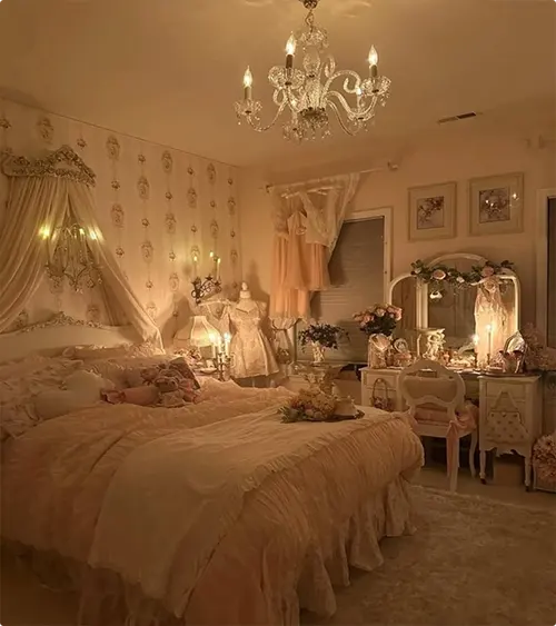 That crystal chandelier, the lace canopy over the bed, the roses everywhere. It’s full-on romantic maximalism.
