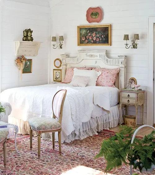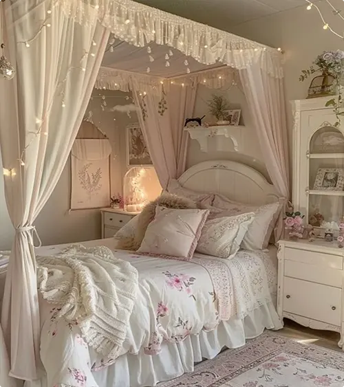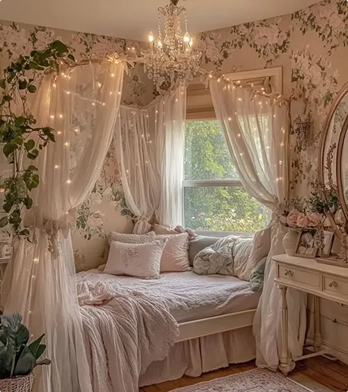 You can use light fabrics, ruffled pillows, or floral prints to bring that gentle charm. Add a soft rug, cozy blankets, or curtains that flow with the breeze. Lighting plays a big part too, warm, glowing lamps or fairy lights make everything feel dreamy.