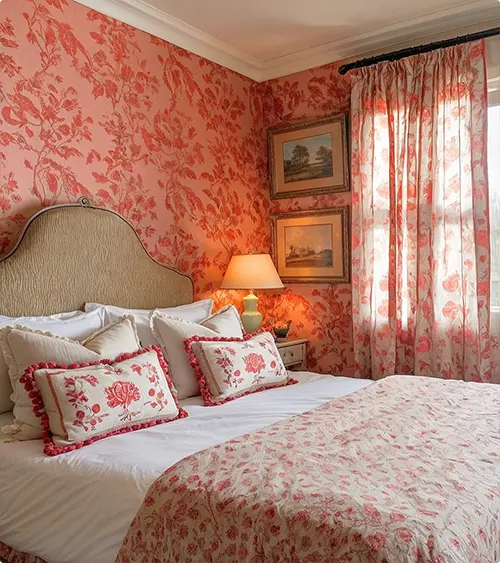 Toile wallpaper in coral tones covers every wall. It’s bold. Most people wouldn’t commit this hard to a pattern but when you do, it pays off.