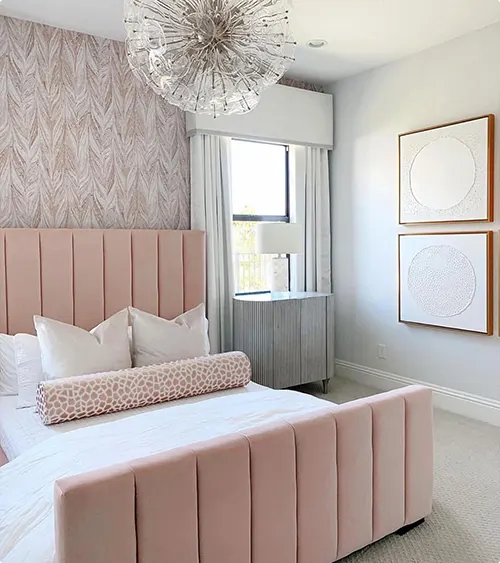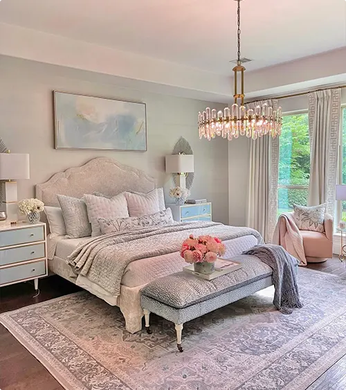 A few golden touches, flowers on the nightstand, or art with delicate colors can complete the look. A feminine bedroom should feel inviting, beautiful, and full of personality, a space that feels like you.