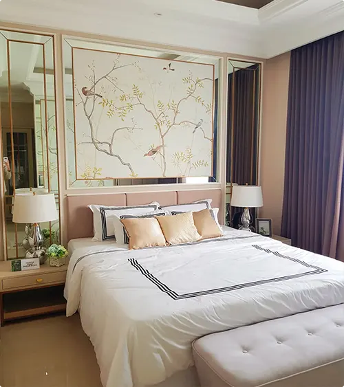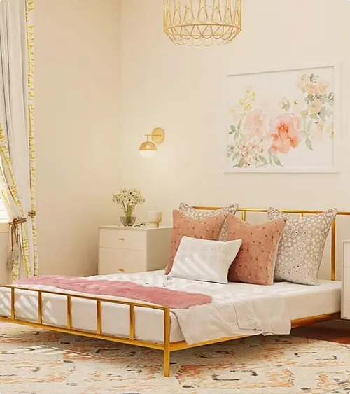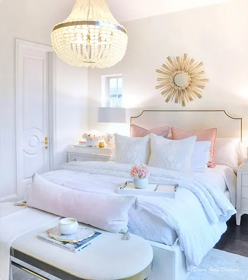 A feminine bedroom is soft, calm, and beautiful. It can have light colors like pink, white, or lavender. You can add flowers, candles, or shiny gold things to make it feel extra special.