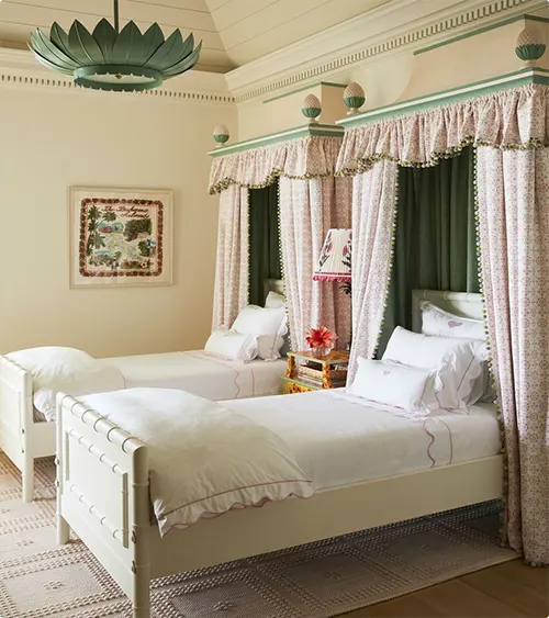 Two beds with a canopy suspended between them. That lotus ceiling medallion in green is the unexpected touch.