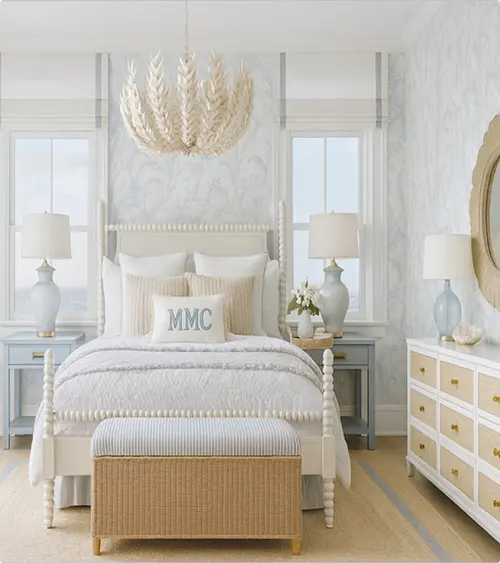 White matelassé bedding adds texture. The room feels put-together but not staged.