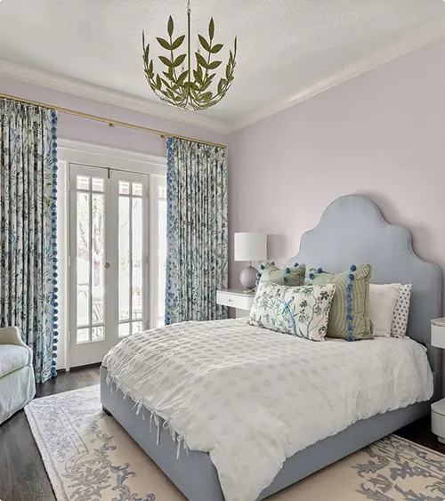 Pale pink walls with a leafy chandelier overhead. The blue floral curtains are the surprise element against all that soft pink.