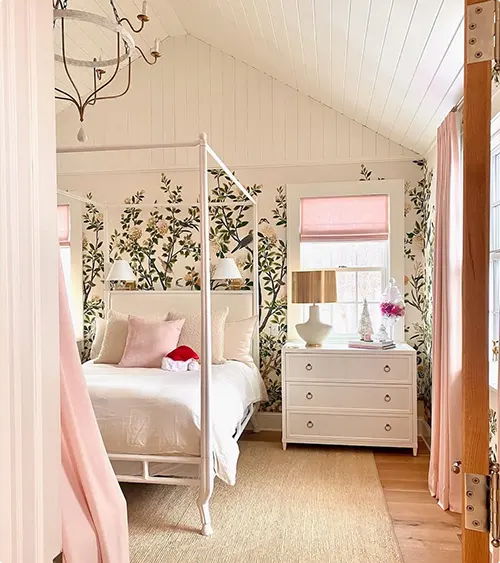 The sloped ceiling actually makes it cozier. And that floral wallpaper inside the canopy? Smart move. It adds pattern without overwhelming the whole room.