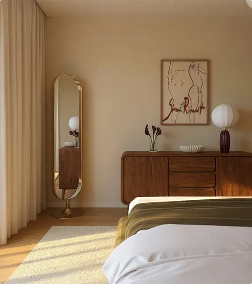 The cream walls and walnut furniture create this really calm, earthy vibe. That full-length mirror with the brass frame is stunning against all the warm wood.