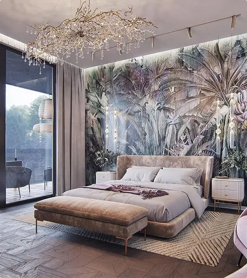 That wall mural is the entire reason this room exists. Palm fronds and tropical leaves in dusty blues and greens cover the whole wall behind the bed.