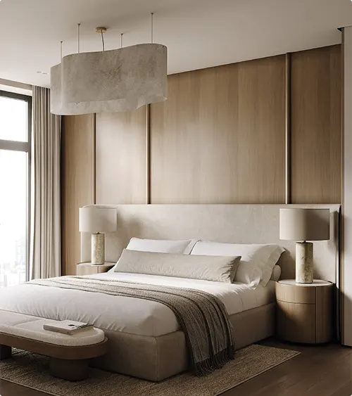 This room is all about architecture and form. That paneled wall behind the bed with the floating nightstands built right in.