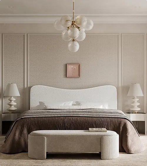 The upholstered platform bed has this soft, rounded edge. The curved bench at the foot continues that gentle shape.