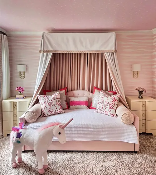That canopy bed with the dusty rose curtains is the centerpiece. The white draping softens the whole look.
