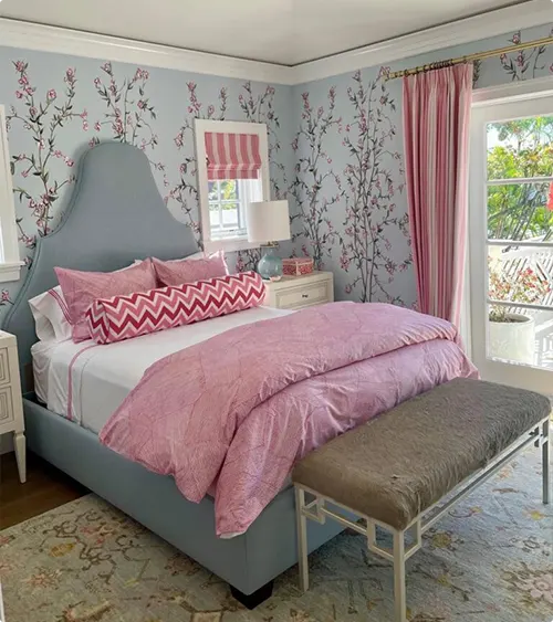 The blue-gray upholstered headboard is such a good anchor for all the pink happening everywhere else. That floral wallpaper has cherry blossoms climbing up the walls.