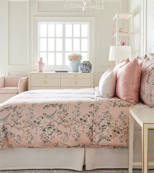 Sometimes you find bedding that’s so pretty you build the whole room around it. That floral duvet with birds and branches is the main event here.