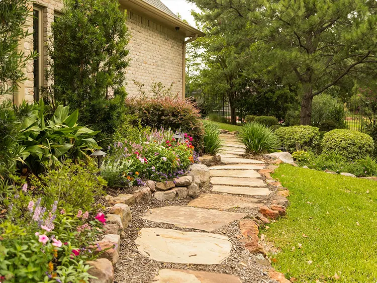 The irregular flagstone path winds through beds of native grasses and blooming plants. Pink flowers peek out along the edges.