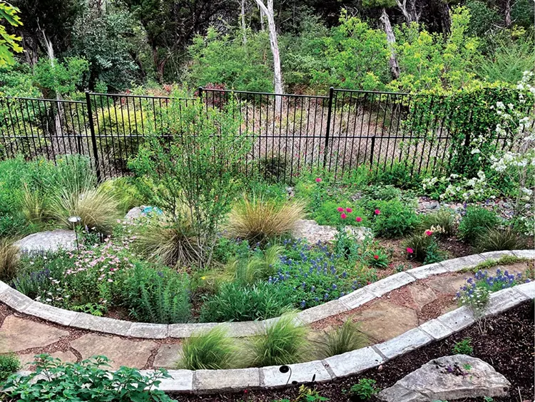 The curved stone walls create these terraced levels filled with native shrubs and grasses. Everything is green and lush without being thirsty.