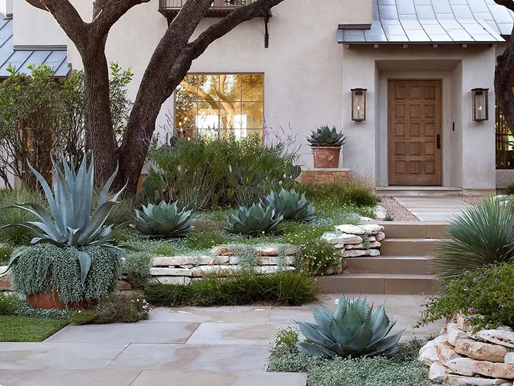 Big blue agaves line the walkway like they’re guarding the front door. The stone steps and gravel keep things simple and modern.