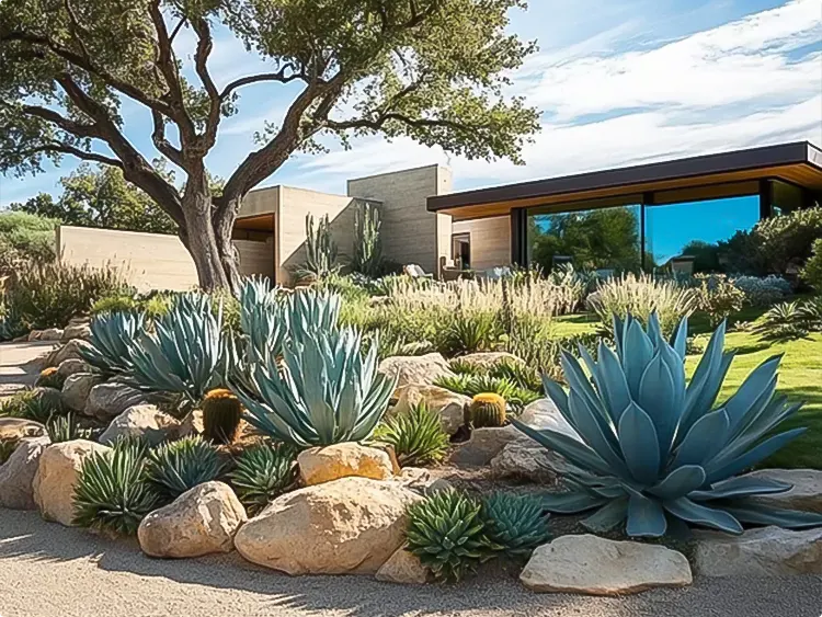 There’s a mature tree providing shade, which is huge in Texas. The rest is just agaves, some ground cover, and a few accent rocks.